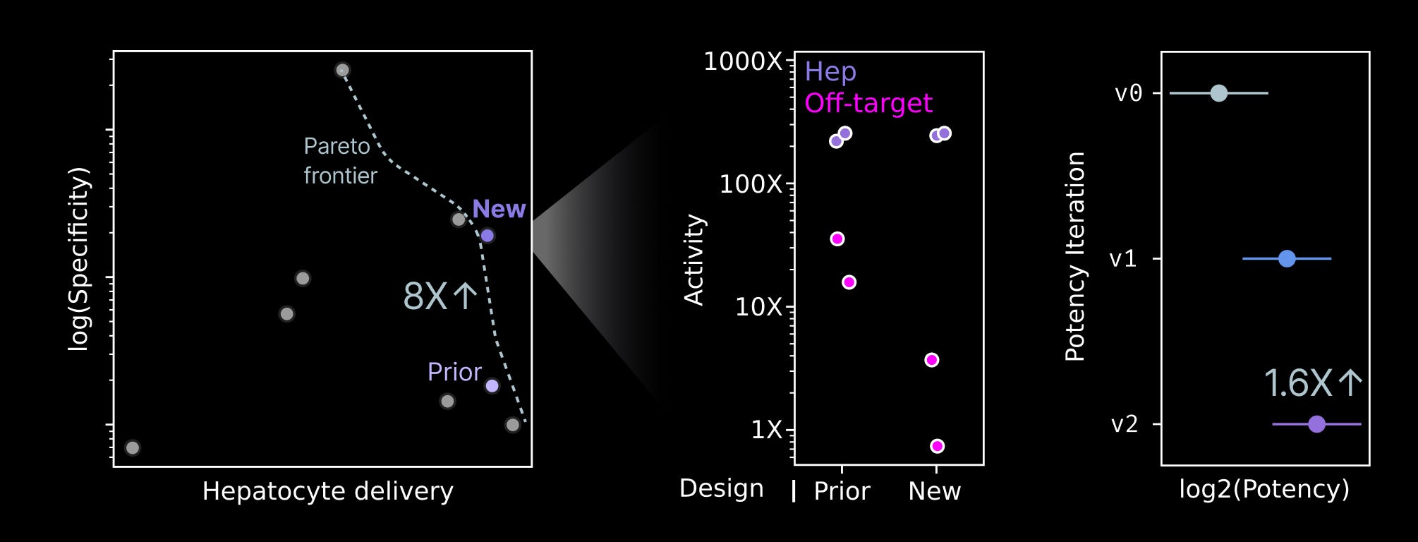 As a result of these improvements, we have now discovered 16 payloads that treat disease in gold-standard animal models, 36 payloads that restore youthful function in cells, 600+ that make old cells look young based on gene expression, and 0 → 1 preclinical candidate.