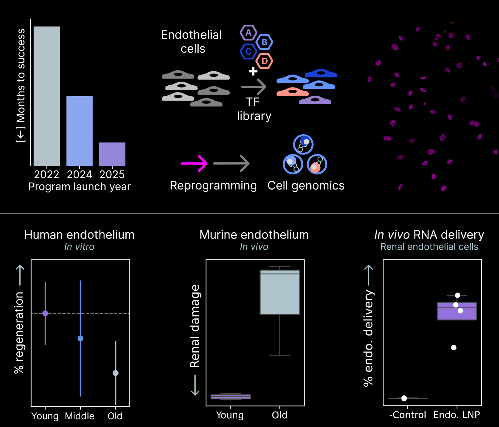 Our team demonstrated that our existing Engine technology transferred to endothelial cells with 0 modifications in just 3 months, 2X as fast as our prior record for onboarding a program. For delivery, we formulated a new lipid nanoparticle chemistry and achieved >60% delivery to kidney endothelial cells. These delivery tools unlock in vivo experiments, and our team also developed both in vitro and in vivo models of endothelial cell age in just four months.