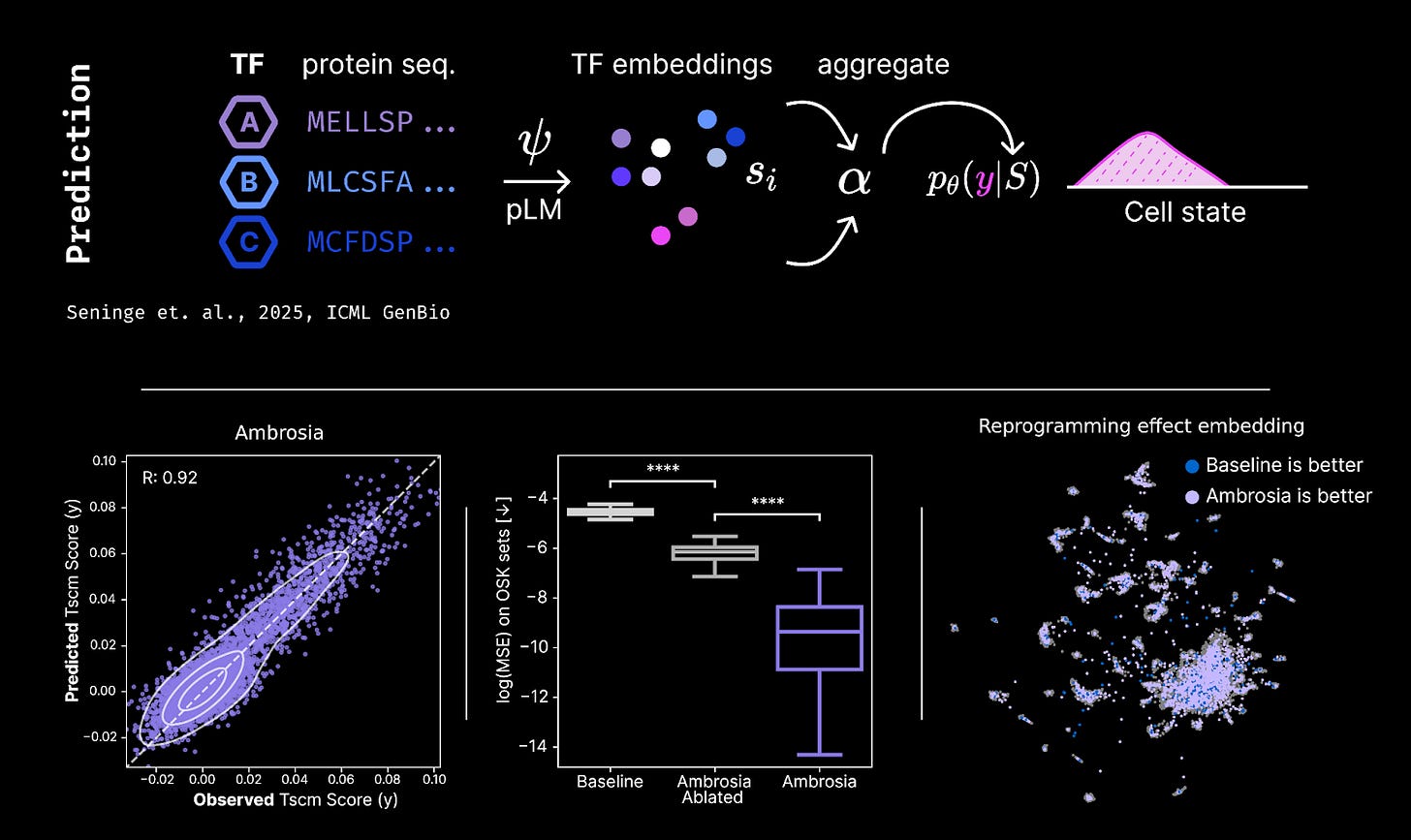 This year we introduced Ambrosia, the first AI system that can accelerate the design of reprogramming payloads. Ambrosia builds atop knowledge captured in foundational models of molecular biology and natural language, initializing our system with a strong prior derived from both human languages and nature’s languages. Our system first learns to predict the effect of arbitrary reprogramming payloads on both the state and function of old cells.