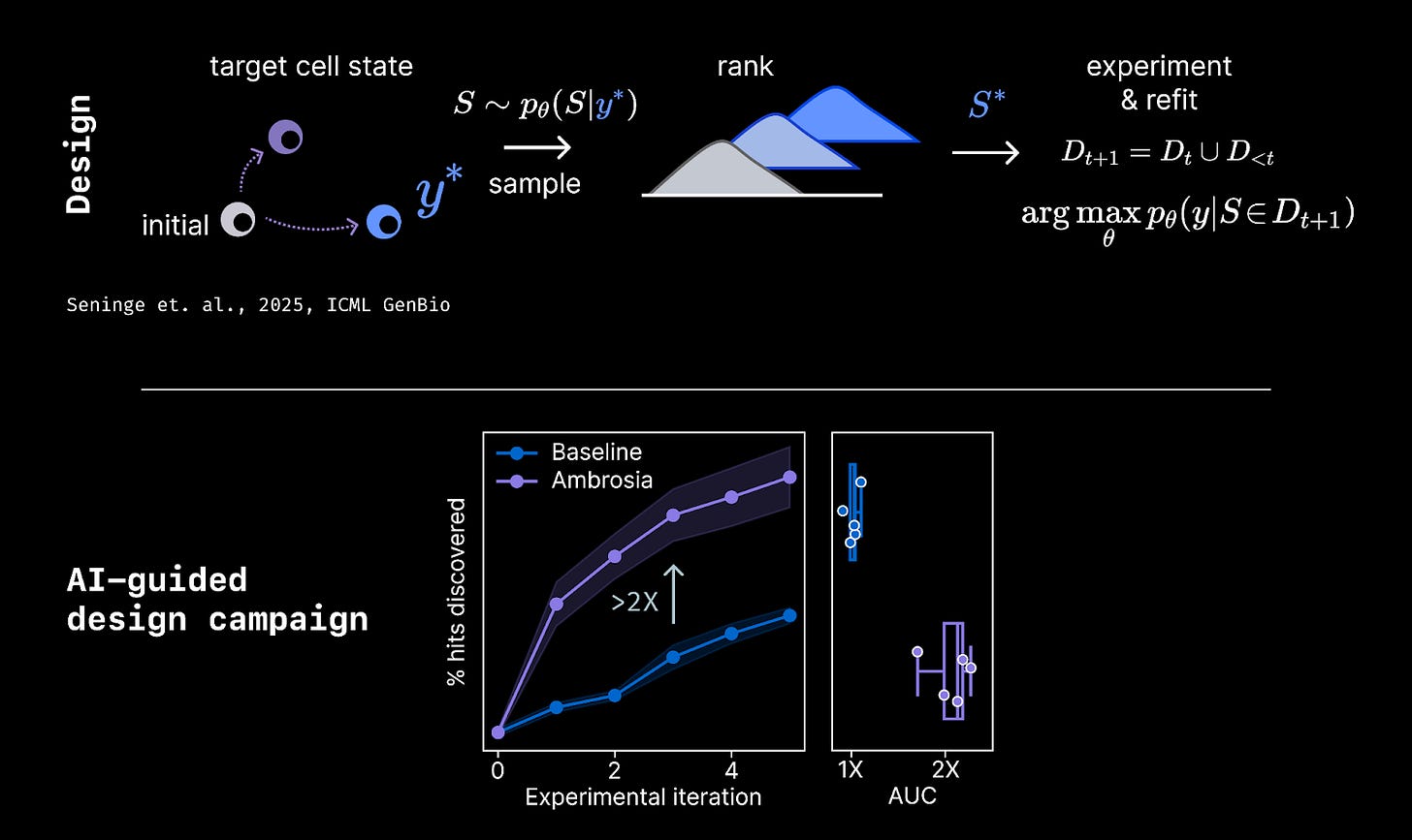 Performance on the initial prediction task is a special case of perturbation prediction (“virtual cell”) modeling, and Ambrosia achieved state-of-the-art performance relative to top baselines in the field. On the latter design task, our latest Ambrosia models improve our rate of discovery by >2X relative to baselines, directly increasing the number of discoveries we make per dollar invested. We believe this is among the first AI systems that has been integrated effectively into a large scale target discovery process.