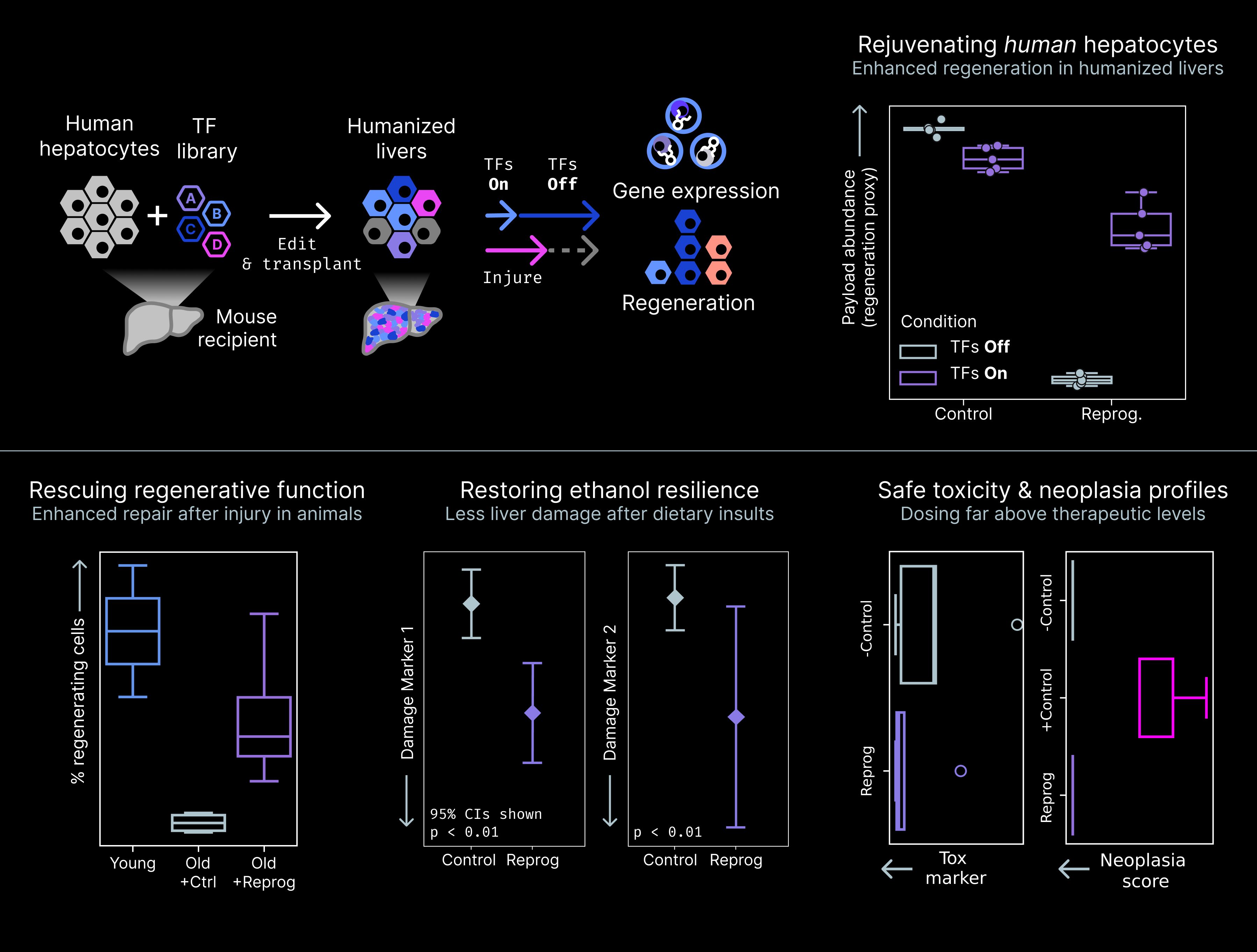 Our first candidate is based on a payload with pleiotropic activity, making old hepatocytes both look young and act young across multiple dimensions. We first discovered the payload in a humanized liver screen where it restored a youthful gene expression profile in old human hepatocytes and improved regenerative function. We then tested if this payload could rescue more than just this one function in this one context.