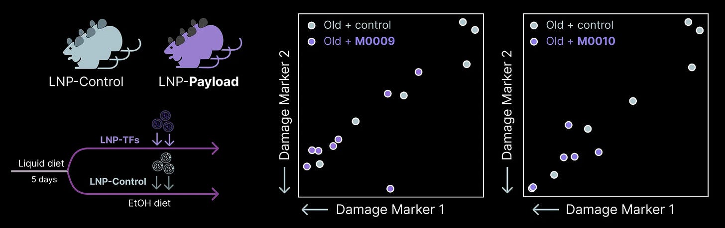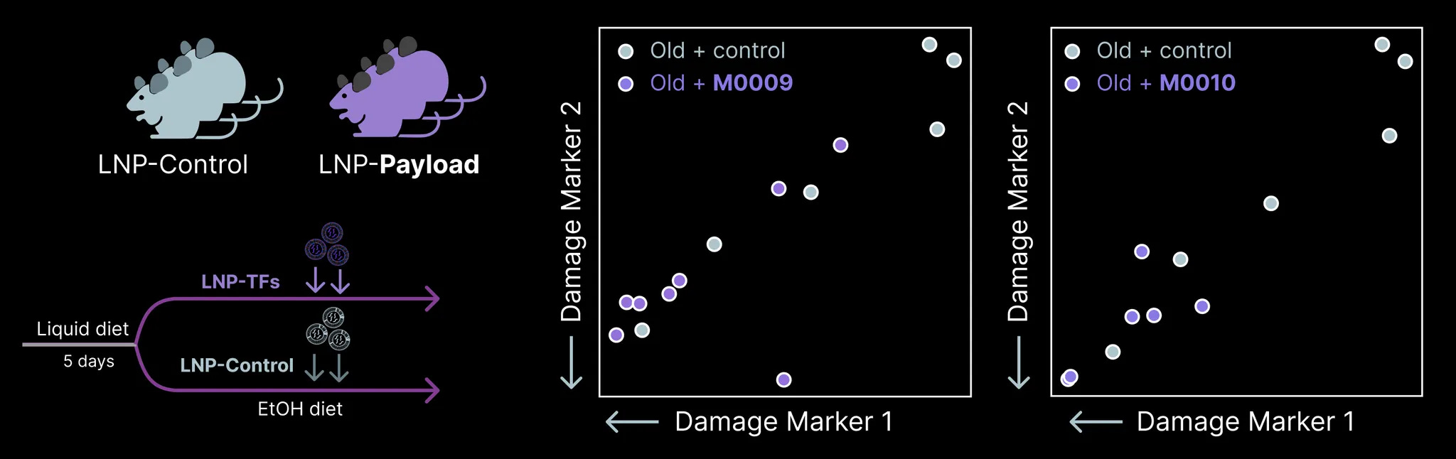 After discovering each payload in a screen, we formulated prototype medicines and tested their ability to protect old hepatocytes from a diet-induced injury. We then measured the amount of damage to the liver using circulating biomarkers of damage. These biomarker proteins are only produced inside hepatocytes. If we find them in the blood, it suggests hepatocytes have recently experienced damage and “leaked” these proteins into the blood. The less we detect, the healthier the liver is.