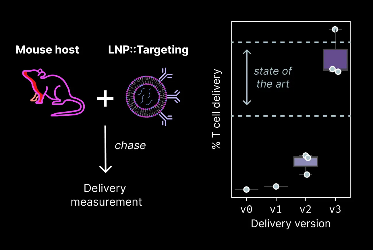 We’ve worked through a series of iterations to arrive at a targeted LNP chemistry that achieves delivery to T cells in mice. Our initial attempts barely achieved delivery of RNA to T cells, but over the course of a few months we were able to nearly match the current state-of-the-art.