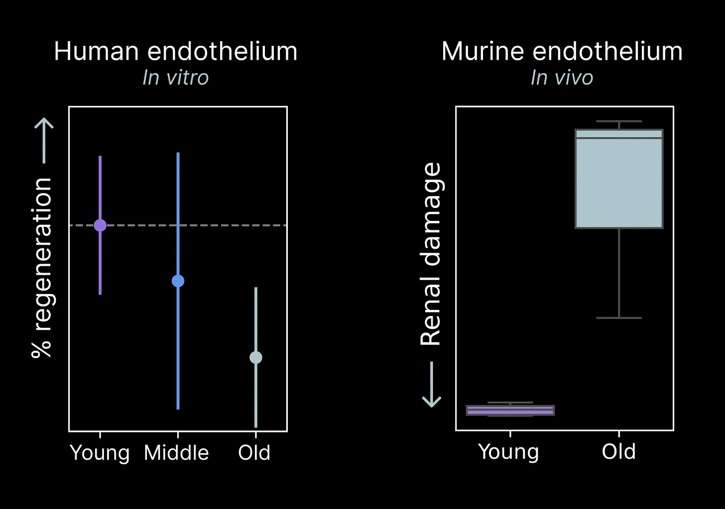 We further tested the impact of age in an animal model of endothelial injury in the kidneys. We found that aged animals display far more damage than their young counterparts, suggesting the aged endothelium may be less resilient to damage as well.