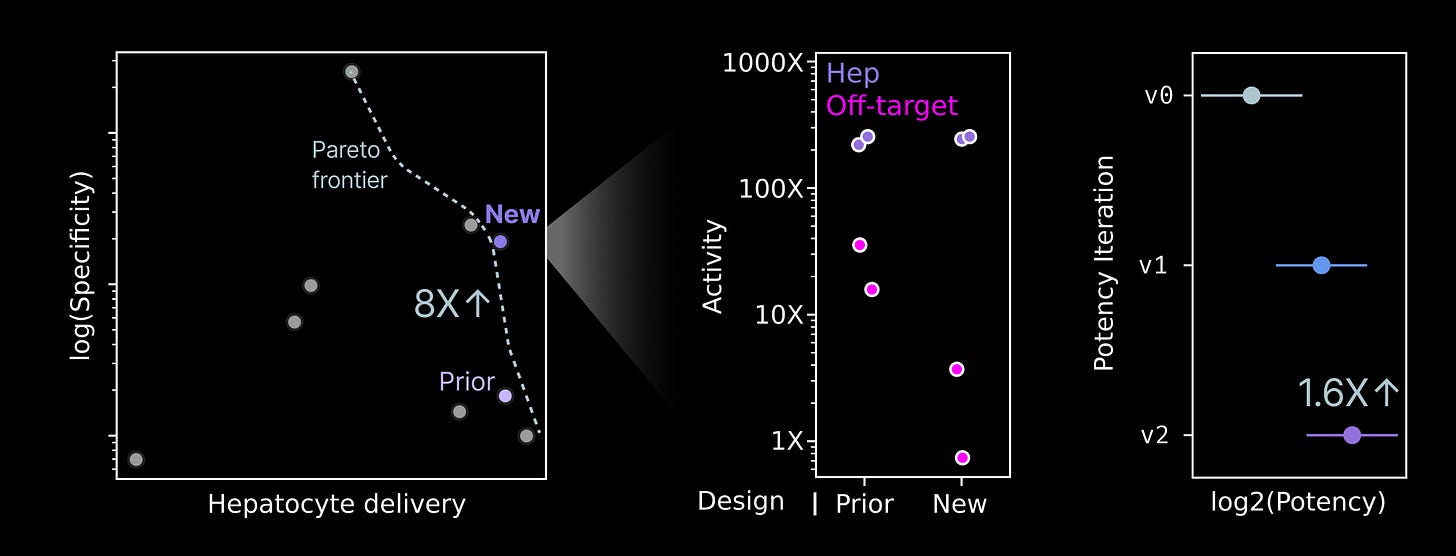 Similar to our potency optimizations, we designed a range of sequences and eventually achieved an 8X improvement in the specificity of our prototype medicine for hepatocytes relative to off-target cell types. Combined with other optimizations, our prototype now achieves a dramatic specificity for hepatocyte activity relative to off-target cell types.